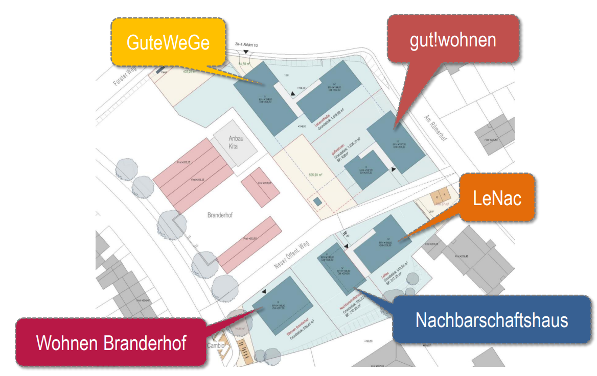 Gemeinsam mit vier weiteren Baugruppen, die sich im Umfeld des alten Gutshofs am Branderhof niederlassen wollen, bilden wir die „Siedlungsgemeinschaft Branderhof GbR„. Diese ist eingebettet in das Quartier Beverau und Delegierte aus jeder Baugruppe arbeiten in Arbeitsgruppen der Siedlungsgemeinschaft. Mit dieser Siedlungsgemeinschaft gründen wir die Genossenschaft “Gut!Zusammen“, in der wir gemeinsam die Struktur, Organisation und Bau der gesamten Siedlung planen und vorantreiben. Alle Bewohner:innen sind Mitglieder in der Genossenschaft und die Genossenschaft baut das Haus als Eigentümerin.